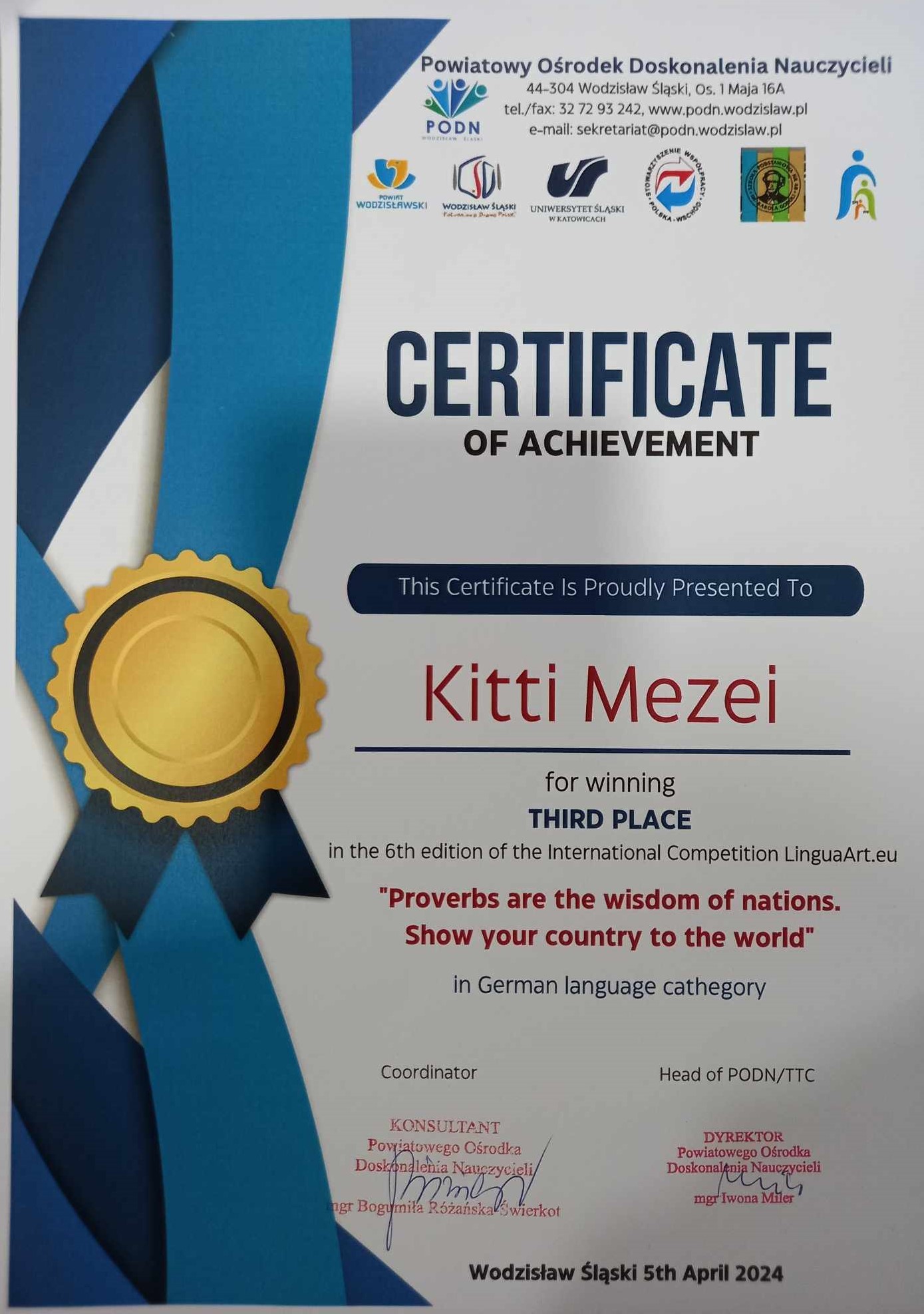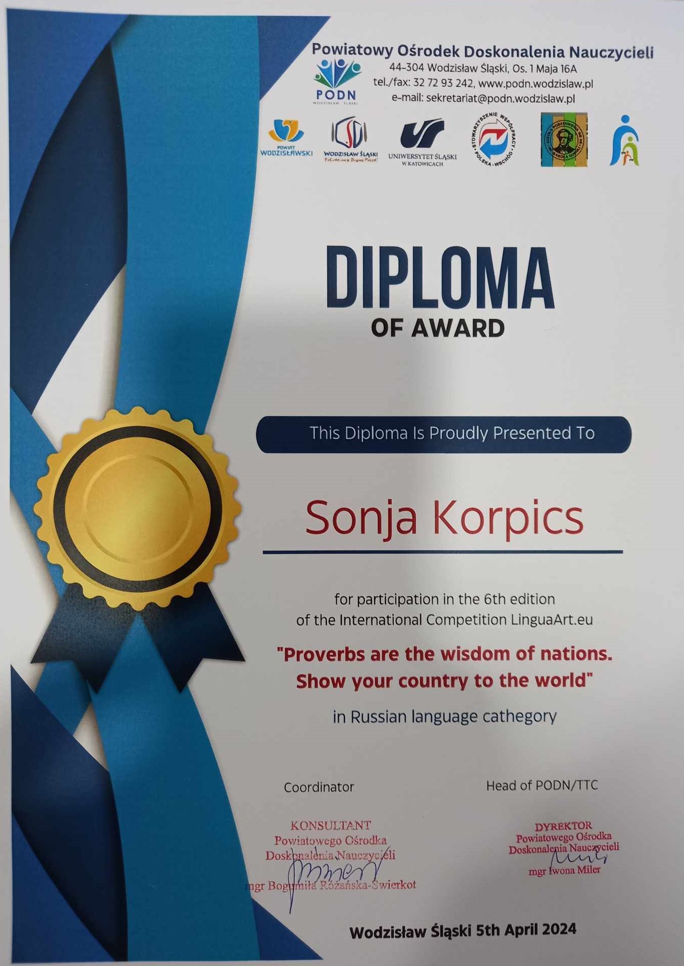 A „Szláv nyelvek és kultúrák” című kétfordulós programsorozatban 11.D osztályos tanulók vettek részt, akik az országos megmérettetésen dobogós helyen végeztek: