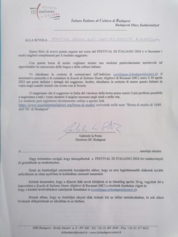Az egyéni és a csoportos díjak mellett iskolánk elnyerte a Budapesti Olasz Kultúrintézet nagydíját is, mely egy kéthetes olaszországi ösztöndíj 1048 euró értékben. A díjat iskolánk képviseletében Herczeg Enikő és Kocsis Gréta szaktanárok vették át Gabriele La Posta Intézetigazgató Úrtól.