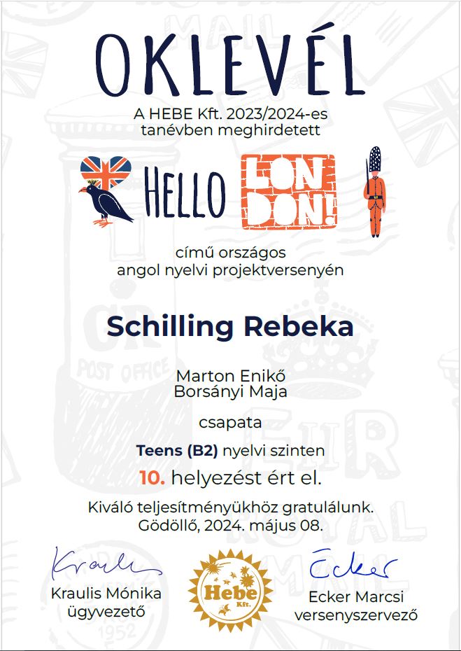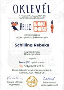 A 2023/2024-es tanévben a 9.A és 9.E osztályból összesen 17 diák vett részt a HEBE Kft. által meghirdetett egyfordulós angol projektversenyen, melynek témája az Egyesült Királyság fővárosa, London volt. A diákok kreatív országismereti feladatokon keresztül bővítették nyelvtudásukat és ismereteiket. Valamennyi tanuló B2 szinten indult és ért el nagyon szoros versenyben szép eredményt.